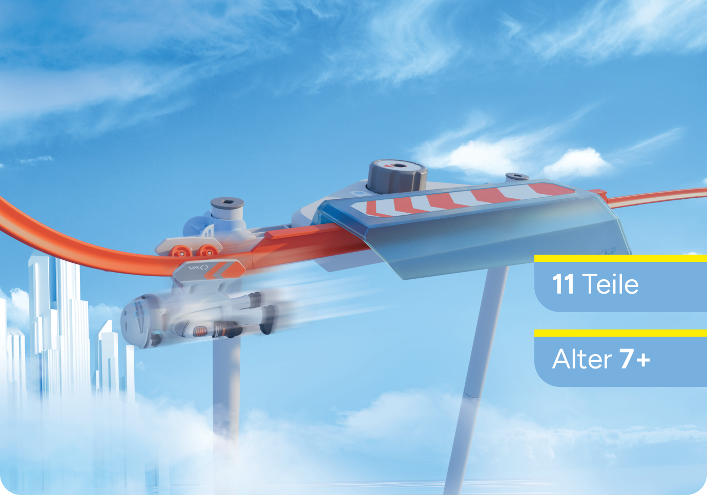 Klemme den Booster an deine Strecke, positioniere den Sky Rider und sieh zu, wie der Mechanismus ihn mit unglaublicher Kraft nach vorne schießt.